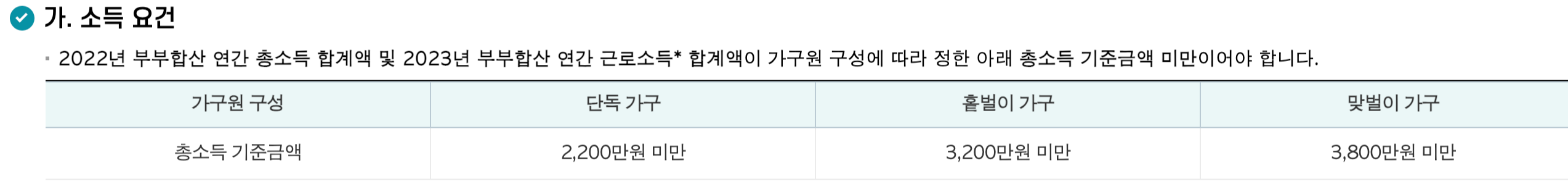 - 단독 가구: 연간 총소득이 2,200만 원 이하